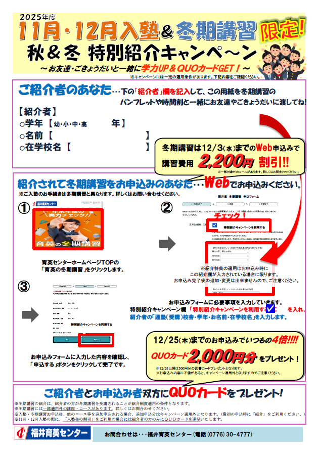 ②冬期講習 特別紹介キャンペーン(11月1日より受付中)